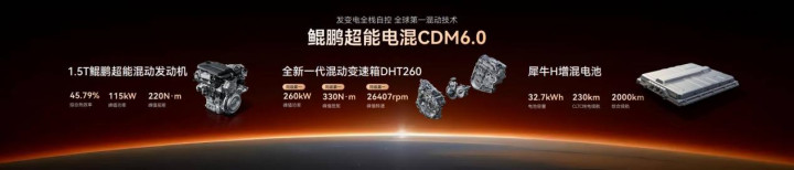 鲲鹏超能电混CDM 6.0以"劲省双全"为核心理念。1.5T发动机45.79%热效率(同级第一),配合DHT260变速箱98.5%机械效率,实现3.9L/100km馈电油耗,中型SUV迈入"3L时代"。230km纯电续航,2000km综合续航。